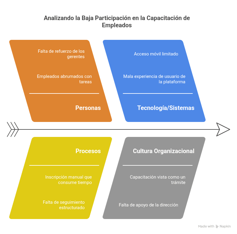- Cultura Organizacional: la capacitación se ve como un trámite; no hay apoyo visible de la dirección
