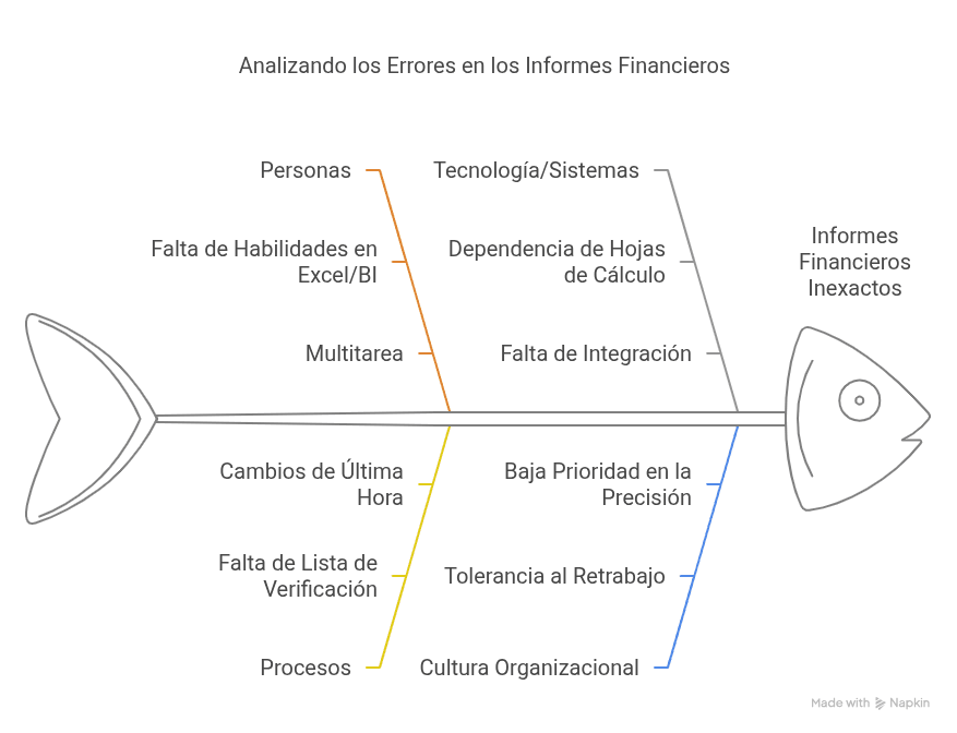 - Procesos: no hay lista de verificación estandarizada para la validación de informes; cambios de última hora no se rastrean