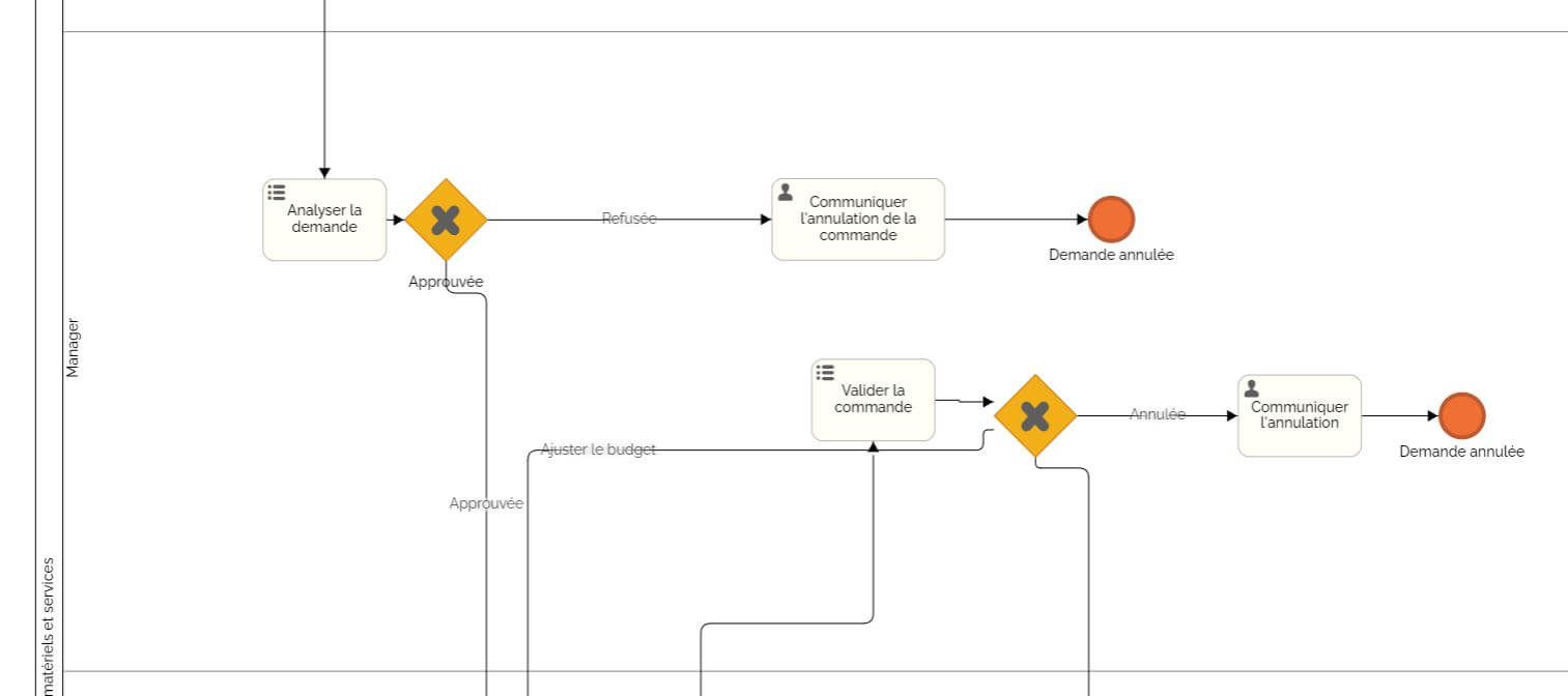 À ce moment, le gestionnaire joue un rôle très décisif. En effet, il peut terminer le processus à un premier niveau de branchement, en n’approuvant pas l’achat. Il peut également le faire à un deuxième branchement. Dans celui-ci il peut  décider de valider la commande avec le devis qui correspond.