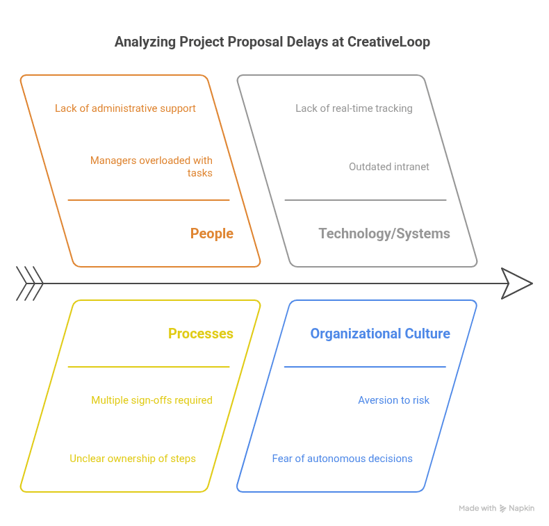 - Processes: approval workflow requires multiple sign-offs; unclear ownership of each step