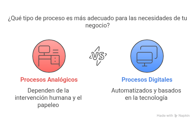 A diferencia de los procesos analógicos que dependen en gran medida de la intervención humana, los procesos digitales están diseñados para operar con mínima fricción, permitiendo una ejecución más rápida, mayor precisión y una visibilidad más profunda en las operaciones.