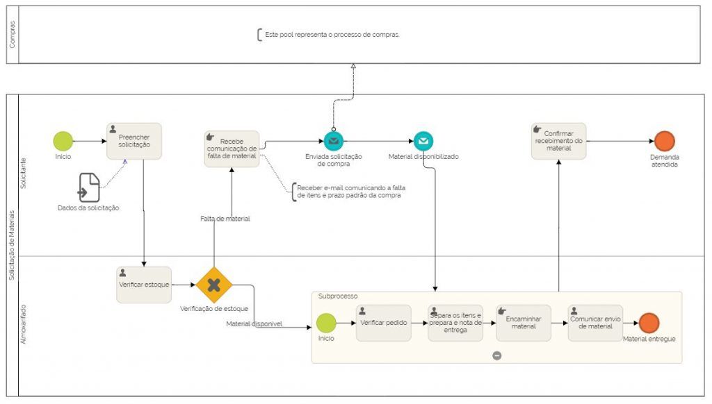 Nesse contexto, a modelagem de um processo de solicitação de material deve seguir um fluxo determinado e padronizado, que obedece uma série de etapas e inclui diversos agentes.