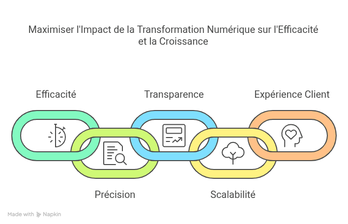 - Scalabilité : À mesure que l'entreprise se développe, les processus numériques peuvent s'adapter facilement sans nécessiter une augmentation proportionnelle du personnel ou des frais généraux.