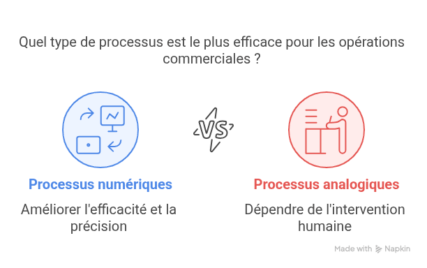 Contrairement aux processus analogiques qui dépendent fortement de l'intervention humaine, les processus numériques sont conçus pour fonctionner avec un minimum de friction, permettant une exécution plus rapide, une plus grande précision et une visibilité accrue des opérations.